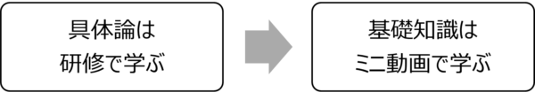 今回の研修の特徴は、ミニ動画を活用する点です。研修内容を動画として撮影し、次の新規採用者が入ってきた際に効率的に初期教育を行えるようにします。これにより、OJTや正式な教育にスムーズに移行することができます。この基本の基シリーズは、初期トレーニングを効率よく行うための動画と、講師による具体的な研修を組み合わせた二本立てのプログラムとなっています。