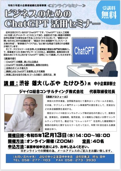そこで、デジタルツールを活用した支援実績が豊富な専門家を講師として、事業者がコストを掛けずにサービスの向上、顧客開拓、業務効率化を図るためビジネスにおける“ChatGPT”活用について講演していただきます。