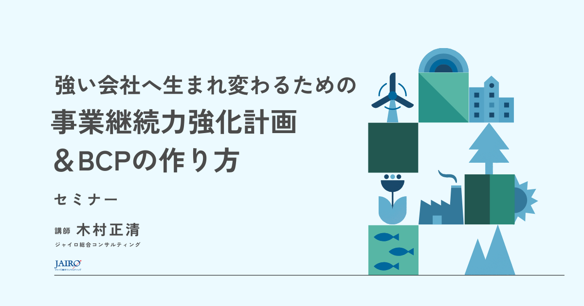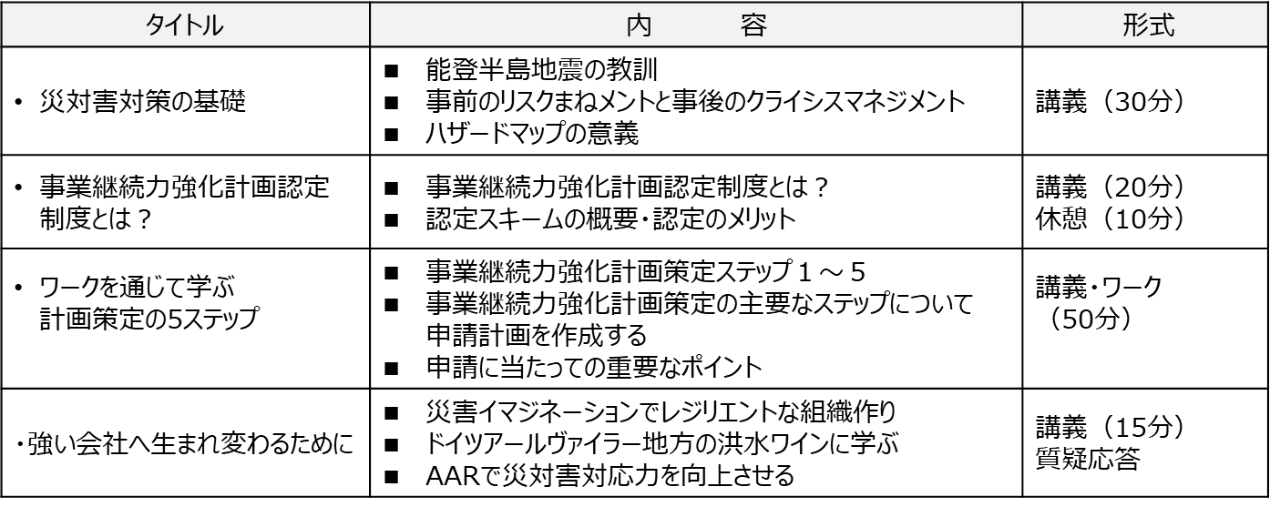 元旦に発生した能登半島地震は改めて地震の恐ろしさと備えることの重要性を教えてくれています。本研修は、事業継続力強化計画認定制度を活用することでBCPを推進する上でのポイントを学びます。本認定を取得することで防災・減災設備に対する税制措置や低利融資、補助金等多くのメリットを受けることができます。この機会に、本認定制度をうまく活用することで、地震や災害に対する備えを行うと共に、災害イマジネーション力を養成し、リスクに強い強靭な組織を目指します。