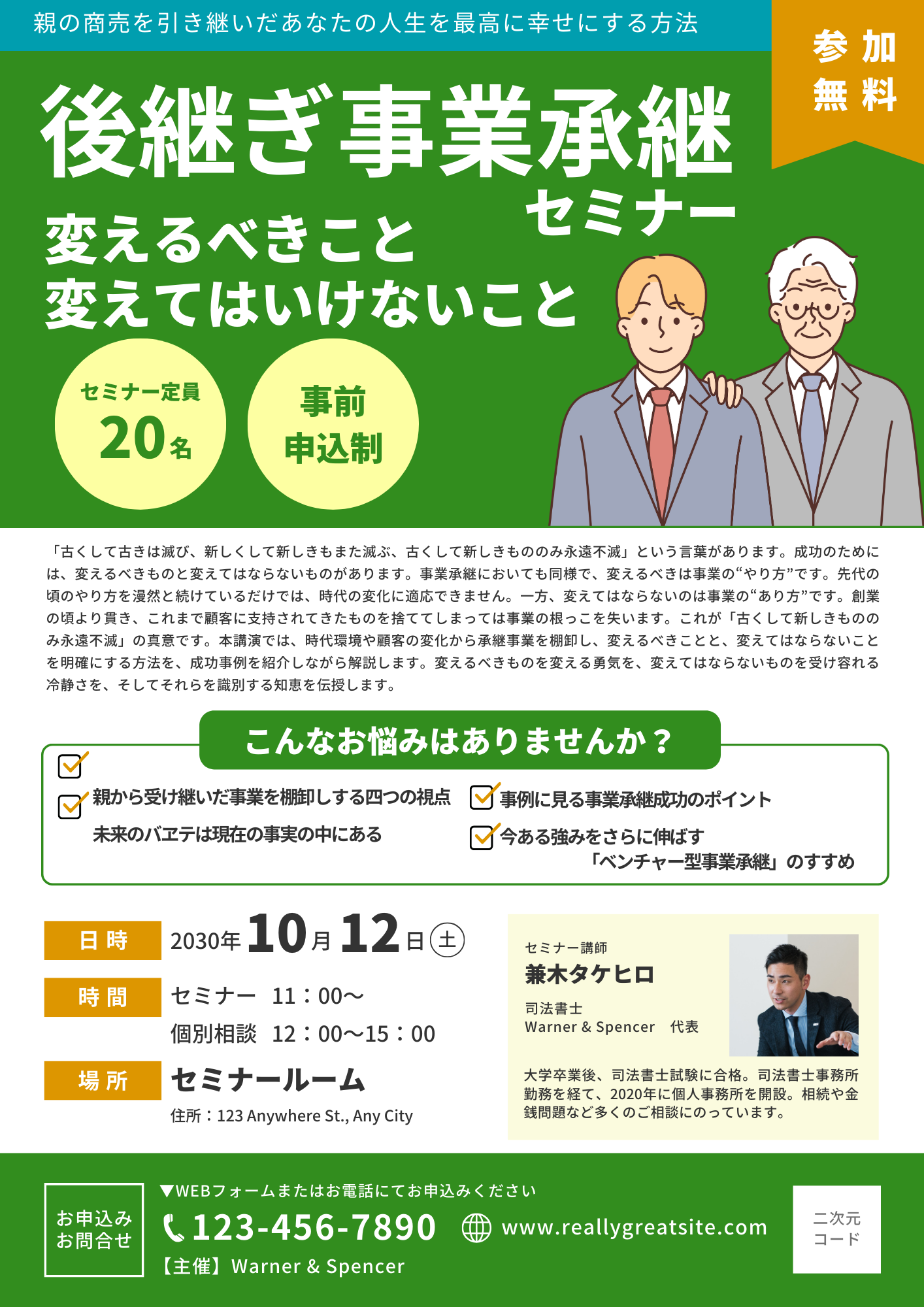 本講演では、時代環境や顧客ニーズの変化から承継事業を棚卸し、変えるべきことと、変えてはならないことを明確にする方法を、成功事例を紹介しながら解説します。変えるべきものを変える勇気を、変えてはならないものを受け容れる冷静さを、そしてそれらを識別する知恵を伝授します。