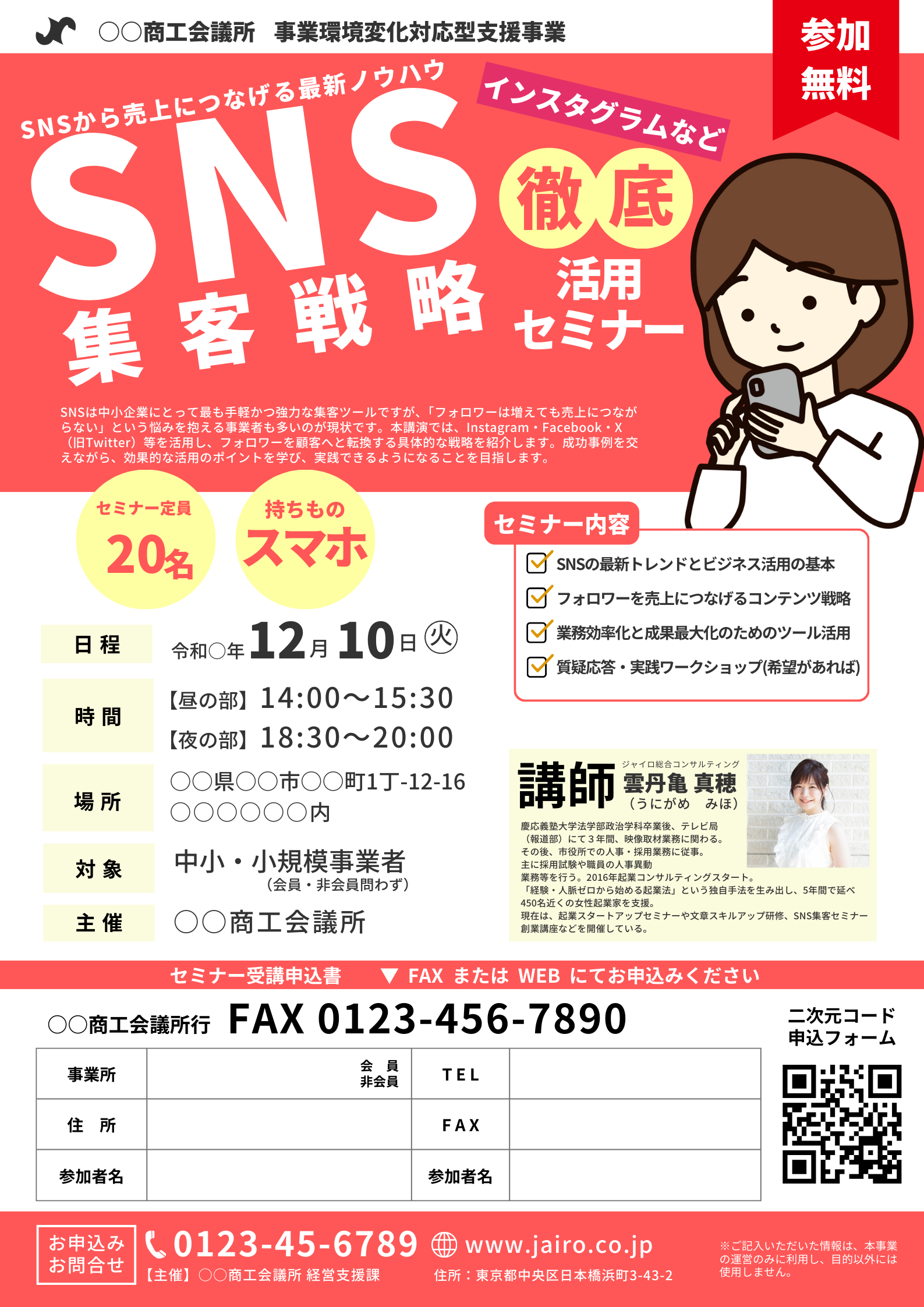 SNSは中小企業にとって最も手軽かつ強力な集客ツールですが、「フォロワーは増えても売上につながらない」という悩みを抱える事業者も多いのが現状です。本講演では、Instagram・Facebook・X(旧Twitter)等を活用し、フォロワーを顧客へと転換する具体的な戦略を紹介します。成功事例を交えながら、効果的な活用のポイントを学び、実践できるようになることを目指します。