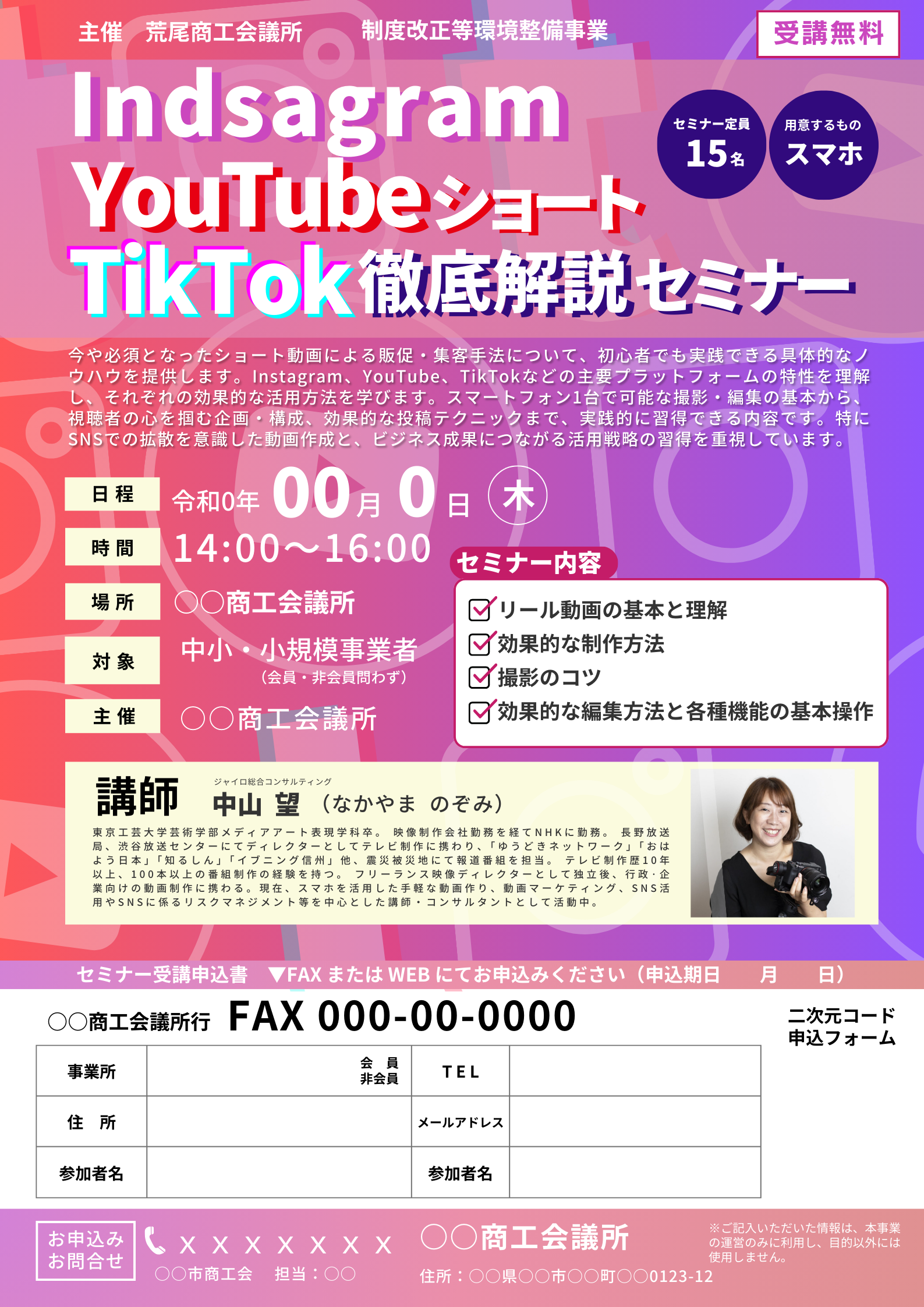 本セミナーの狙いは、Instagramのリール動画を効果的に活用し、短時間で多くの情報を発信する技術を習得することです。特徴として、リール動画の基本的な理解から実践的な制作テクニック、そしてマーケティング戦略まで包括的に学べる点が挙げられます。短時間で注目を集める動画制作スキルや、ターゲット設定からコンテンツ企画までの戦略立案能力の向上を図ります。また、成功事例を基にした具体的なマーケティング施策を学ぶことで、即実践可能なノウハウを提供します。教育業、小売業、サービス業など幅広い業種の方々に対応し、Instagramを活用した販促強化やリール動画初心者にも最適な内容となっています。