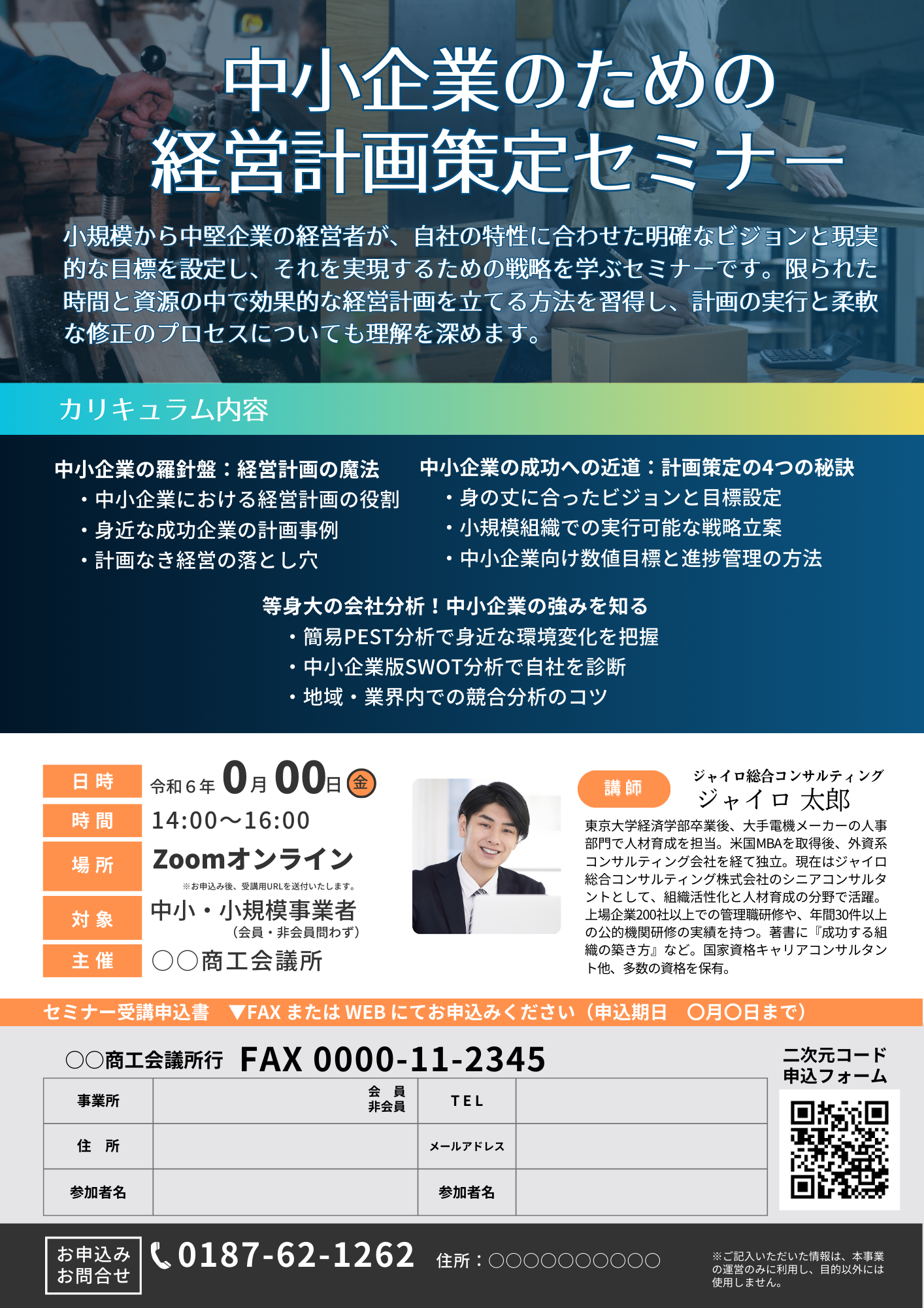 | 40分 | 中小企業の成功への近道:計画策定の4つの秘訣 | ・身の丈に合ったビジョンと目標設定 ・小規模組織での実行可能な戦略立案 ・中小企業向け数値目標と進捗管理の方法 |