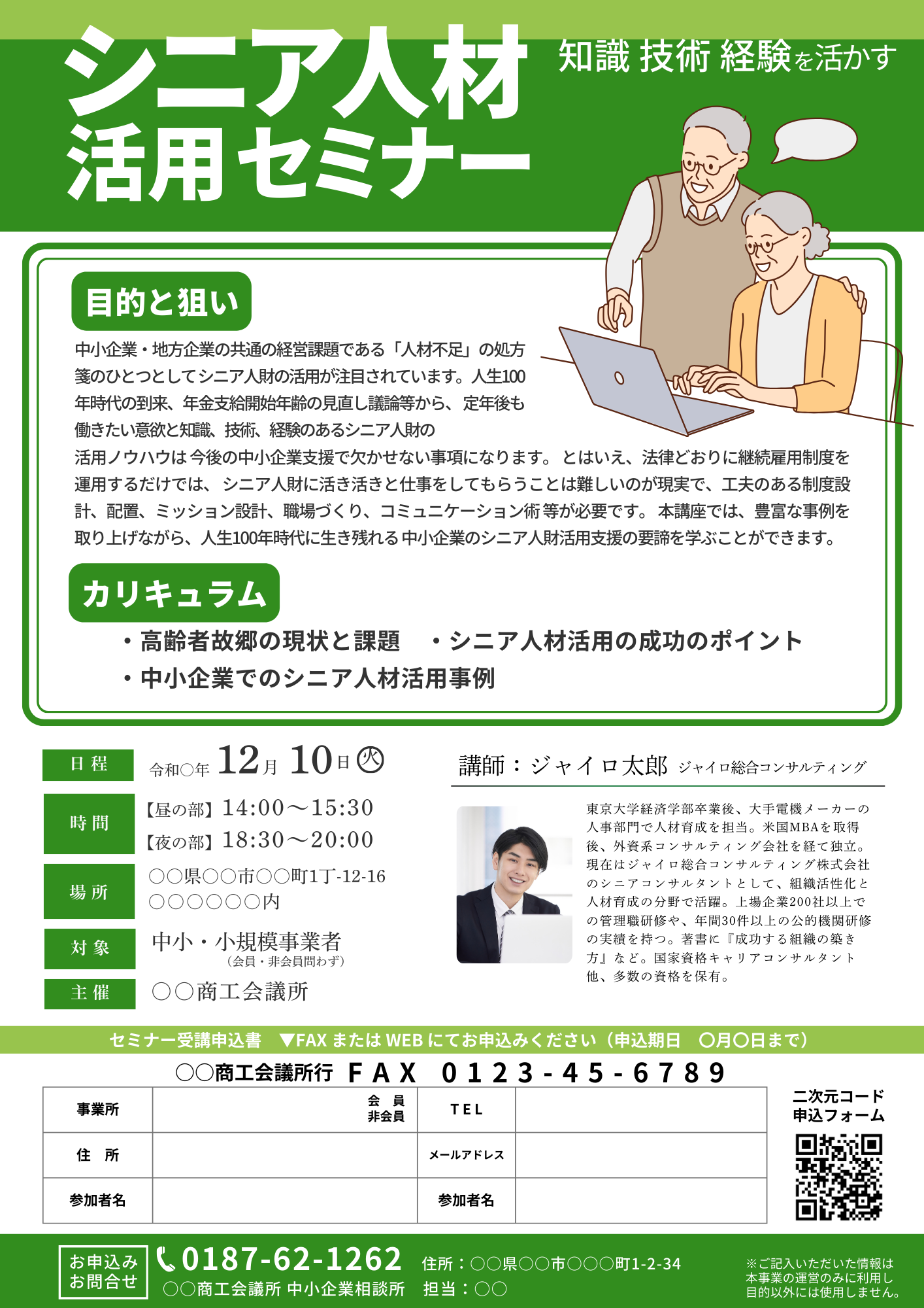 中小企業・地方企業の共通の経営課題である「人材不足」の処方箋のひとつとして シニア人財の活用が注目されています。 人生100年時代の到来、年金支給開始年齢の見直し議論等から、 定年後も働きたい意欲と知識、技術、経験のあるシニア人財の活用ノウハウは 今後の中小企業支援で欠かせない事項になります。