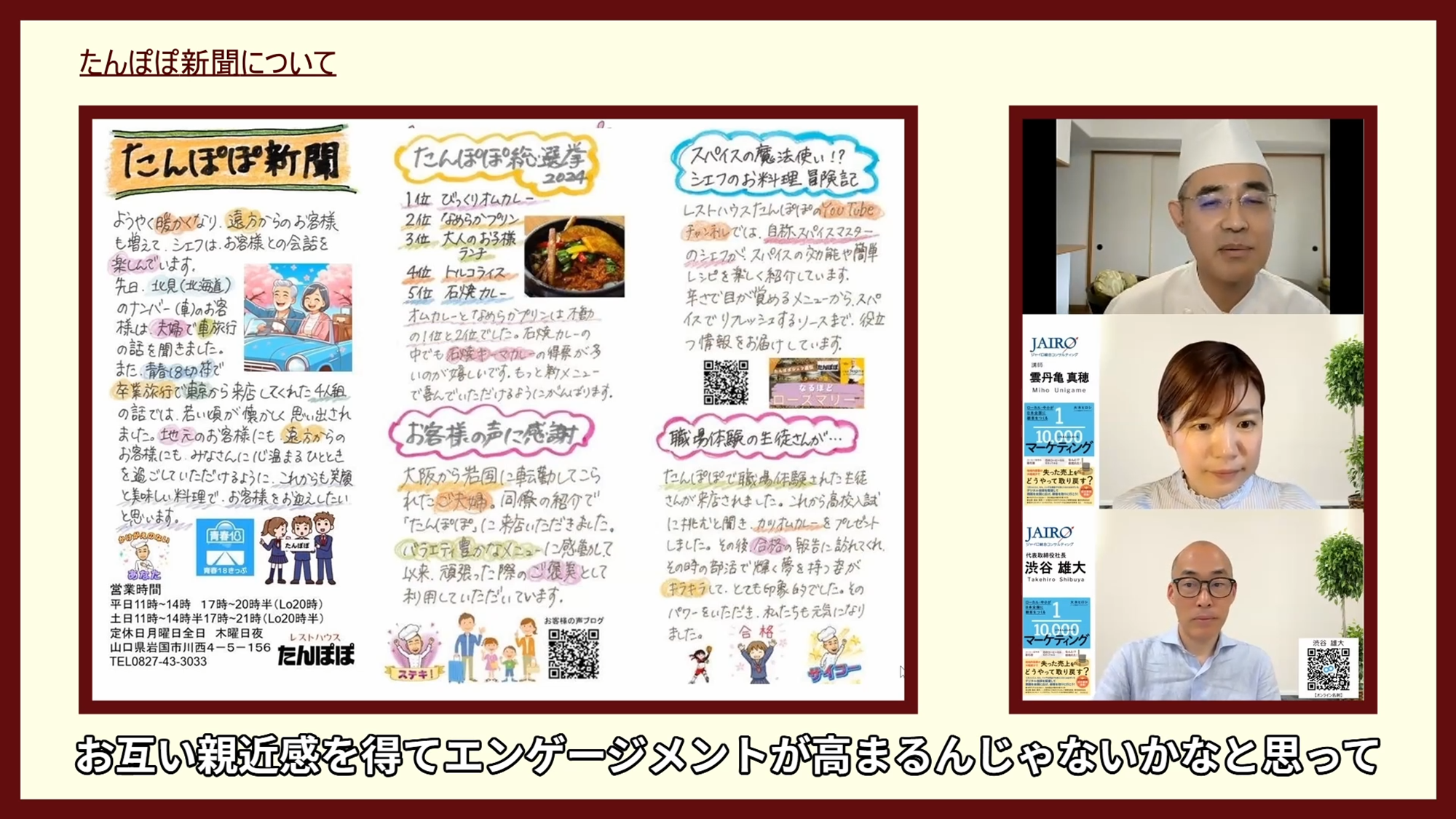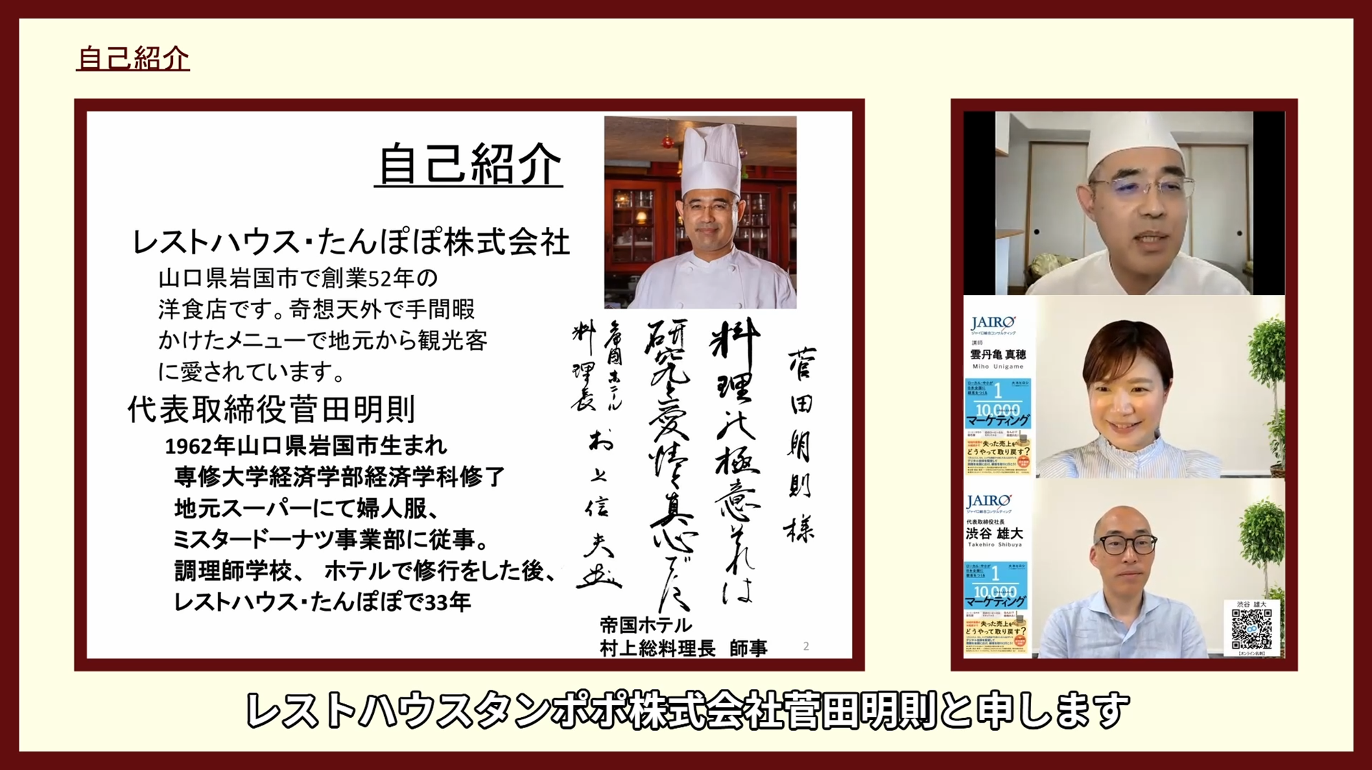先日、Zoomミーティングにレストハウスたんぽぽのオーナーである菅田社長をお呼びしました。