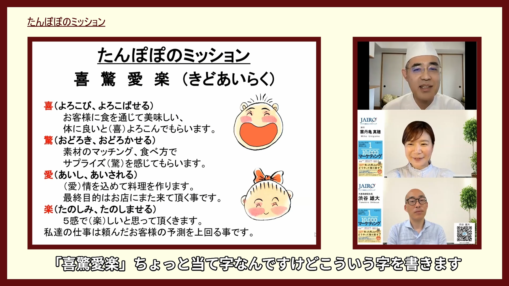 たんぽぽのミッションは「喜驚愛楽」で、お客様とスタッフが喜び、驚き、愛し、楽しむことを目指しています。また、アナログマーケティングとして24年前からアンケート用紙を使い、顧客リストを作成して6300人以上のデータを管理。ニュースレターやバースデーカードを郵送し、コミュニケーションを深めています。