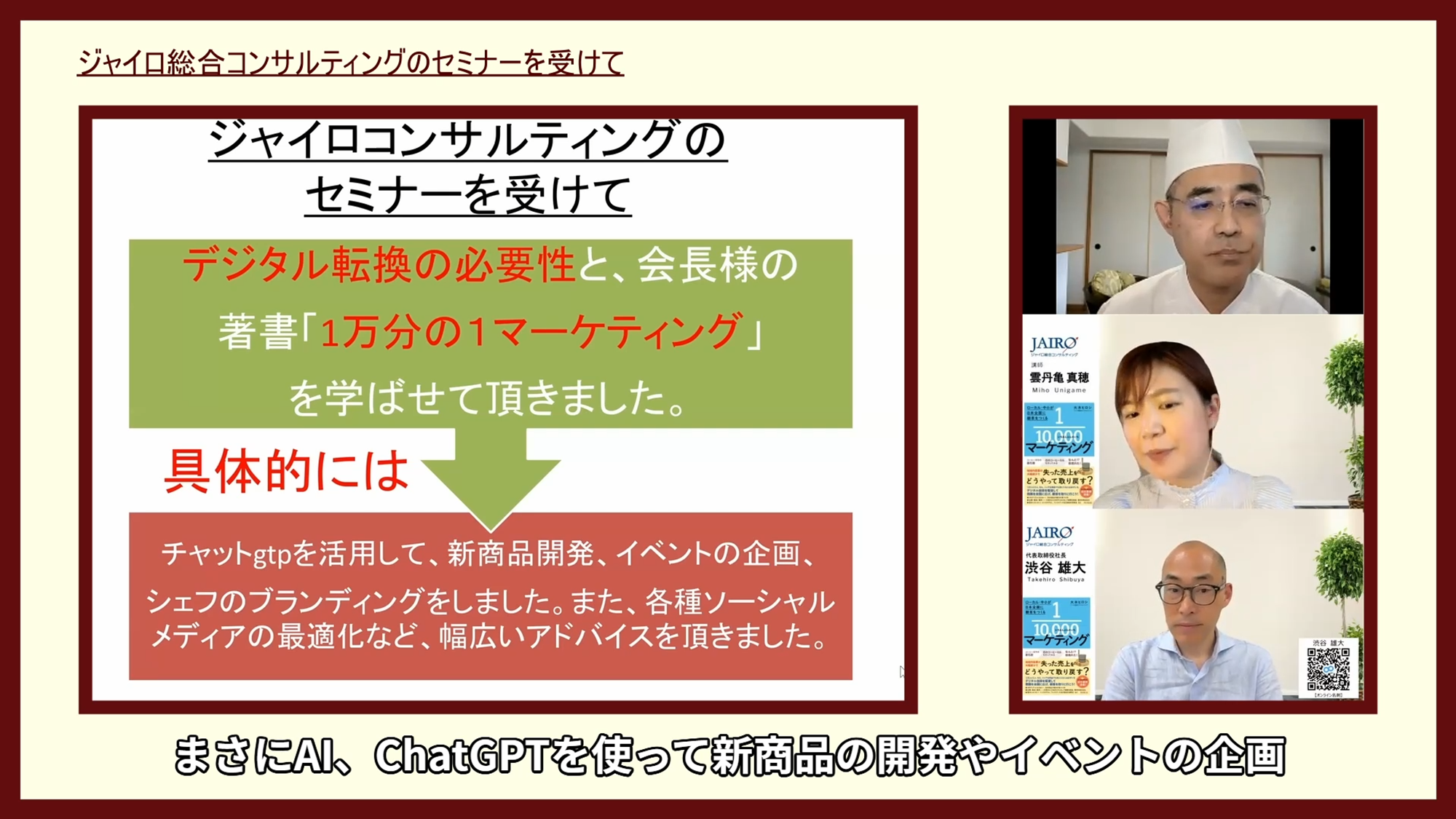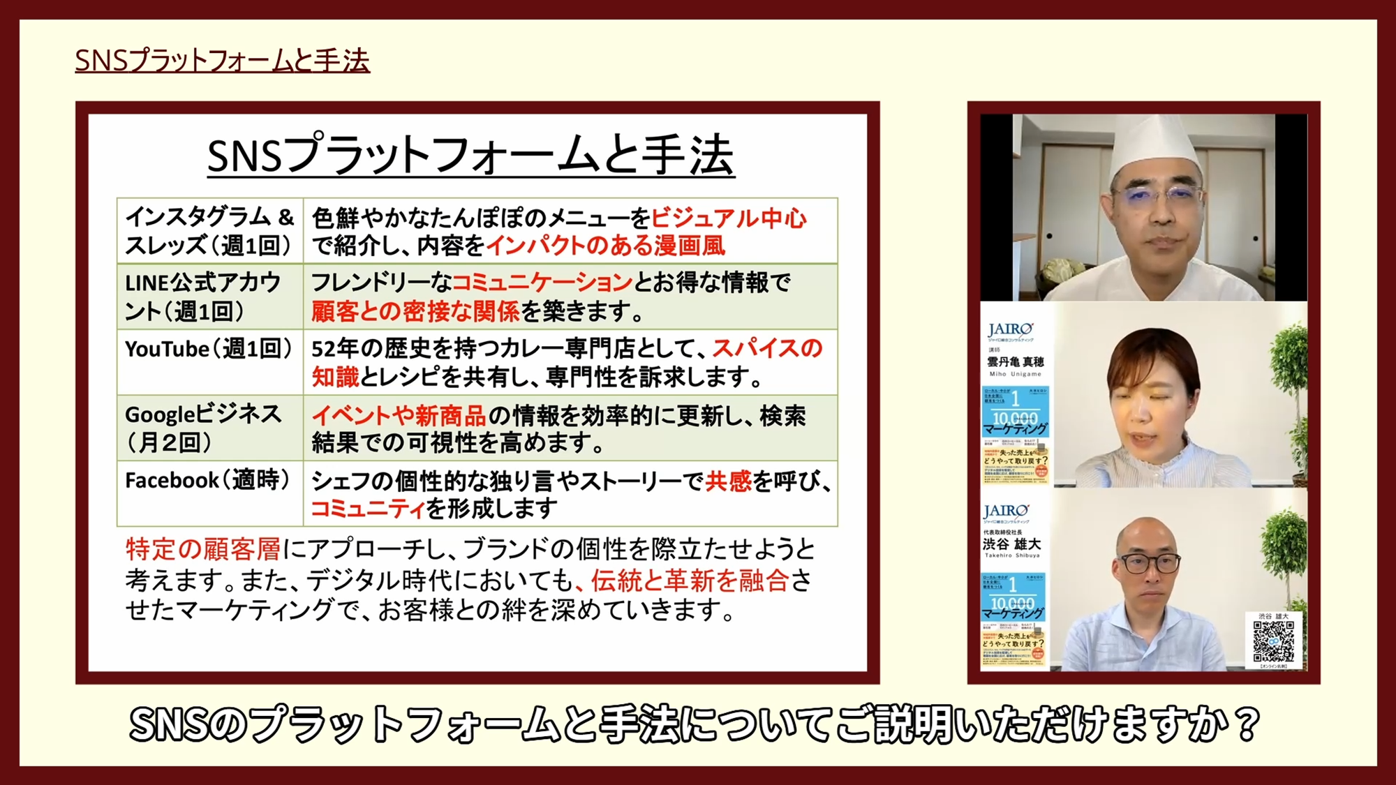 また、デジタルツールを迅速に活用する姿勢も素晴らしいです。病気をきっかけに、後方支援としてデジタルマーケティングに注力し、実践しています。例えば、YouTubeでは最初はクッキング動画を配信していましたが、反応が薄かったため、スパイスの知識を提供する形式に変更しました。AIツールのVrewも活用し、簡単に字幕付きの動画を作成しています。