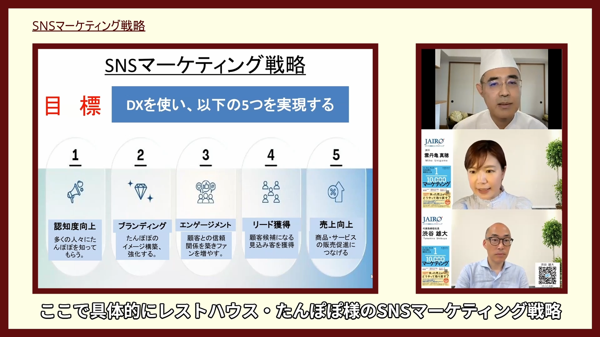 デジタルマーケティングの重要性を感じた菅田社長は、ChatGPTを活用して新商品開発やイベントの企画、シェフのブランディングを行い、SNSの最適化も図りました。特に、InstagramやLINE公式アカウント、YouTube、Googleビジネス、Facebookを活用し、以下の5つの目標を設定しました。