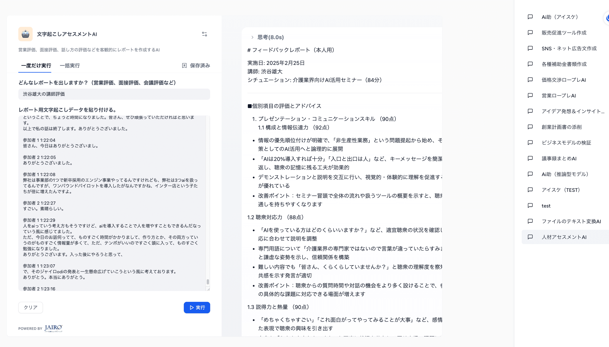 ジャイロ総合コンサルティングが開発しているビジネス特化型AIツール「Ai助(あいすけ)」では営業のロールプレイだけではなく、その営業内容の評価、人材アセスメントまでも行うことができます。
