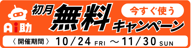 10/24(金)〜11/30(日)の期間中、Ai助をご新規でお申し込みいただいた方限定で、初月利用料が無料となるキャンペーンを実施中!