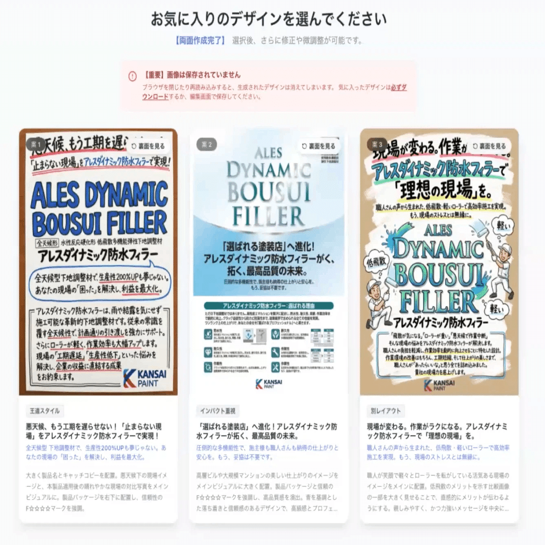 また、手書きのラフ画を写真に撮ってアップロードすると、3パターンのプロ仕様POPが生成される様子には、「デザインの知識がなくても、アイデアさえあれば形にできる」という新たな可能性を感じた方が多かったようです。
