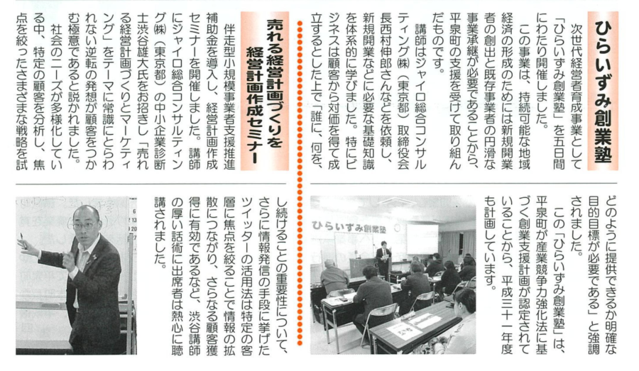 平泉商工会報でジャイロ総合コンサルティング講師のセミナーが紹介されました。