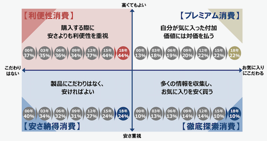 野村證券が数年ごとに調査しているデータがあります。ここでは「利便性消費=少々高くても利便性を重視する」とするスタイルが2015年から44%と高い数値を維持している一方で、安さ納得消費や撤退探索消費は低推移。プレミアム消費は22%と頭打ちになっています。ただし共働き世代はプレミアム消費が微増しています。
