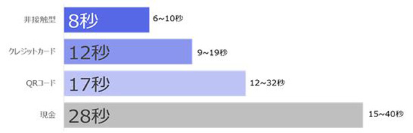 ちなみに最小値は、非接触は6秒、クレカは9秒、QRは12秒、現金は15秒。最大値は、非接触は10秒、クレカが19秒、QRが32秒、現金は40秒となっていて、現金に近いほど振れ幅が大きくなる結果となっています。