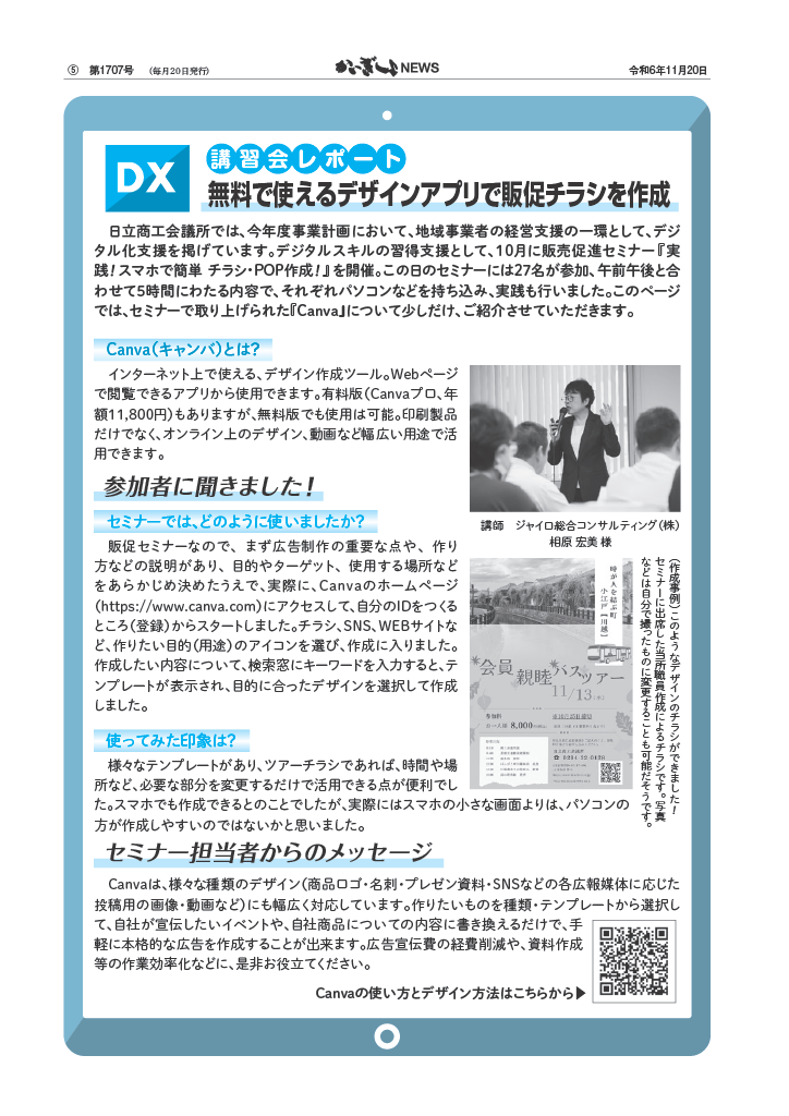 先日行なわれました。日立商工会議所主催 相原講師のセミナー「デザイン力UP!Canva講座」の反響が良かったことから中小機構会報 11月号に掲載いただく事となりました。